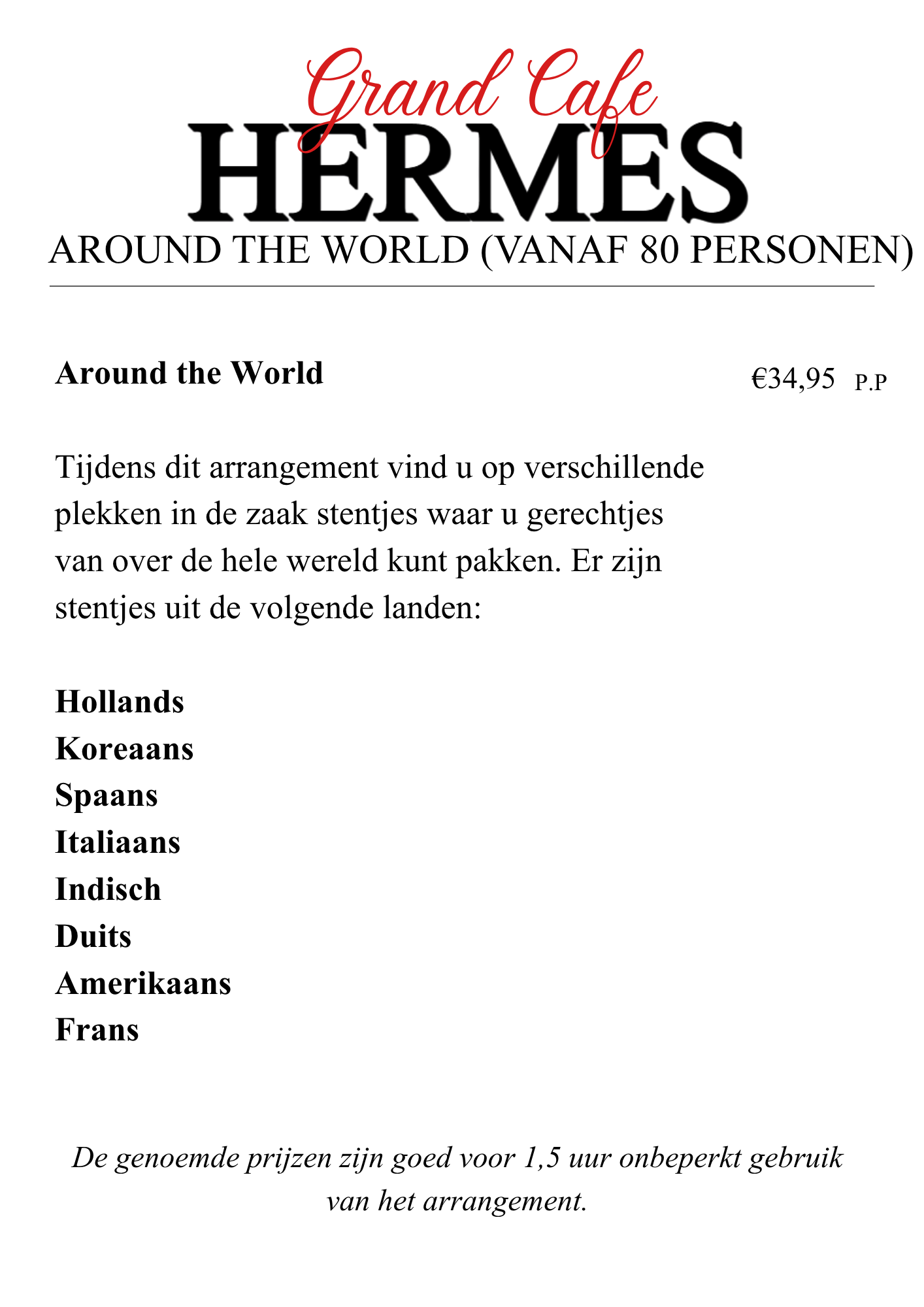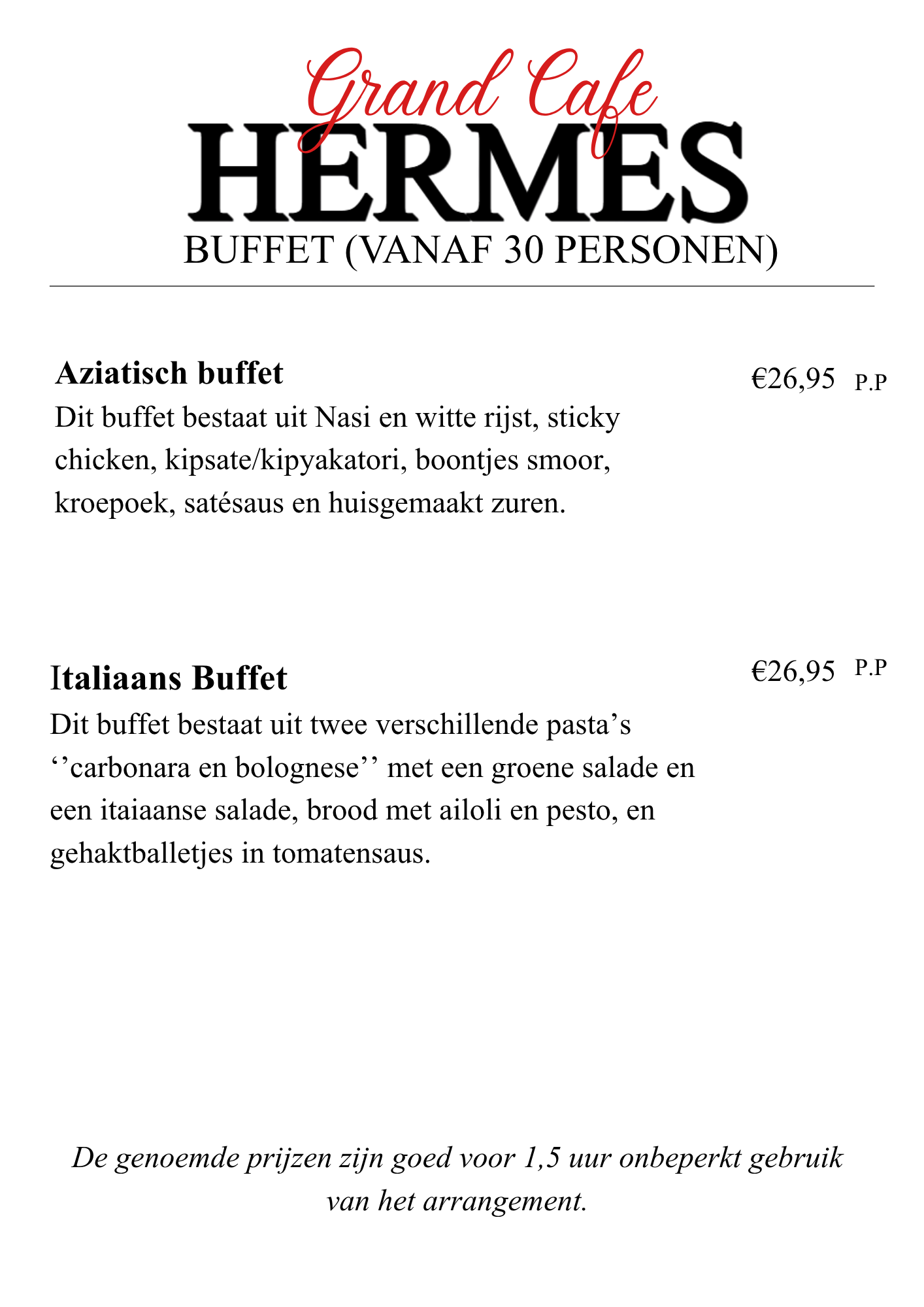 Gelegen op het Orlyplein voor station Amsterdam Sloterdijk is Hermes een perfecte ontmoetingsplaats en prima geschikt voor vergaderingen, partijen, bijeenkomsten, (bedrijfs)borrels, lezingen en informatiedagen. Speciaal hiervoor hanteren we bij Grandcafé Hermes diverse arrangementen. Op deze pagina vindt u welke arrangementen er mogelijk zijn. Dit is mogelijk van 10 tot 200 personen.